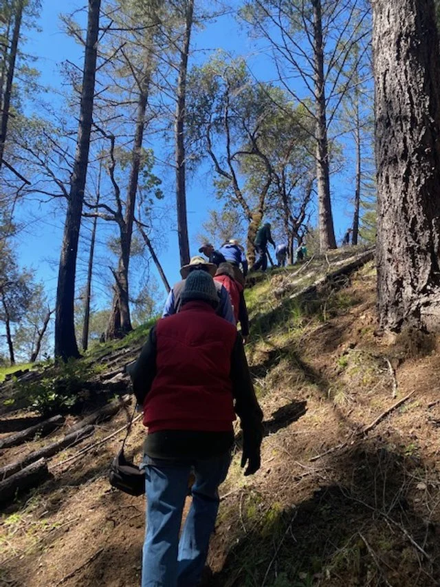 After all the information about the burn that we had learned we then headed out to walk to where the burn had taken place. Along the way we saw parts of the 15 forested acres that had not been prepared, some that is ready for the next burn and then the parts that had been burned. The parts that had no prep look like most anywhere in this County that hasn’t been maintained - lots of underbrush, lots of downed limbs and some trees, lots of leaves and duff. The parts that had been prepped were clear of all of that and everything was neatly piled up ready to burn. Most impressive was the part that had been burned - there was visibility underneath the trees and the only things on the ground were the remains of logs from the thinning that will decompose over time but don’t leave enough fuel for a wild fire. Additionally, there was green growth of grasses and wild flowers. The end of the walk was highlighted with a small burn. We had seen at the beginning of the walk a “fairy ring” of Redwoods that had been severely burned; one of the lessons learned was that the old stumps can put out a lot of heat when burning and severely damage the new trees growing from it. One way to help prevent that was to burn the duff and limbs near the stumps ahead of time so that the prescribed burn doesn’t reach the stump and burn it and damage the remaining trees. The impromptu burn was the end of our field trip.