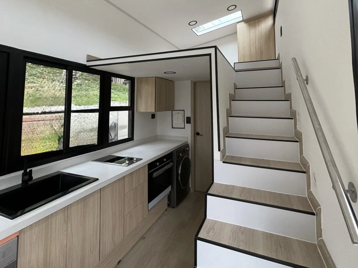 The studios are built in Colombia and shipped to California. They come as a standard model with a living area, bathroom with shower, kitchen with full size appliances and a sleeping loft. The units can be customized to some extent, with choices in paint colors and materials. They can also configure this to accommodate two more bedrooms by attaching a deck between the two units. They are small in size to comply with the ADU rules.